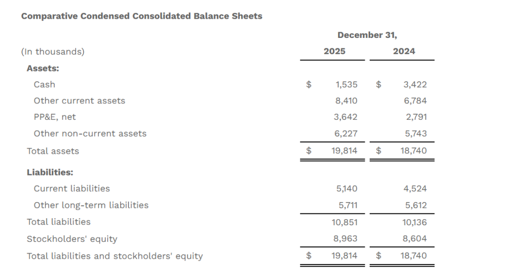 - Year end 2025 cash balance of $1.5 million, down from $3.4 million at year end 2024, with total assets of $19.8 million and stockholders’ equity of $9.0 million.