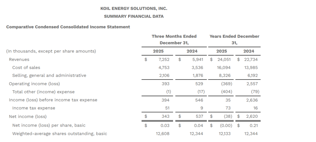 Koil Energy Solutions reported Q4 2025 revenue of $7.3 million with full year 2025 revenue of $24.1 million, up modestly year over year but with lower profitability as adjusted EBITDA fell versus 2024 while net income for the year turned slightly negative, pointing to mixed momentum despite solid top line growth.