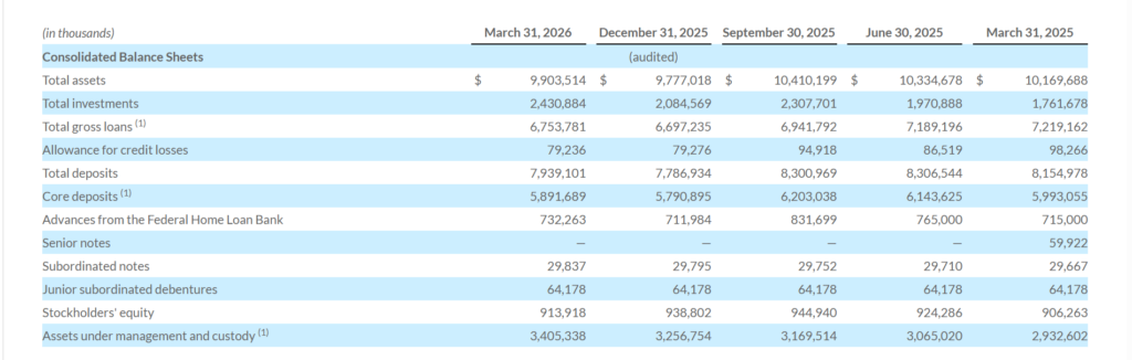 - Total assets ended the quarter at $9.9 billion, up 1.3% from $9.8 billion at December 31, 2025.