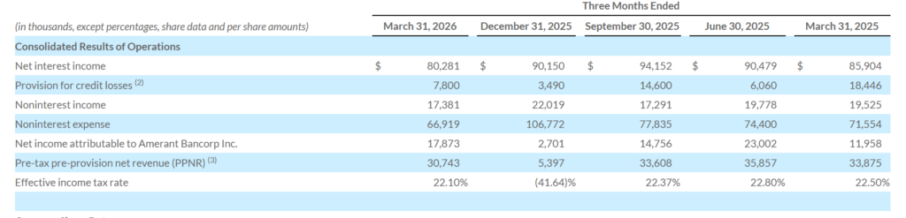 - Net income attributable to Amerant Bancorp Inc. was $17.9 million in Q1 2026, up sharply from $2.7 million in Q4 2025.