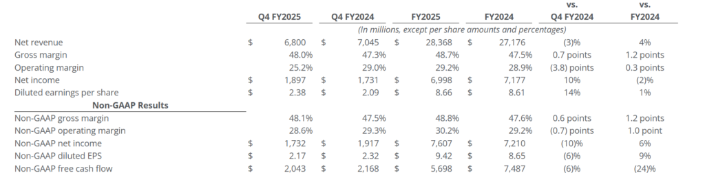 - Q4 FY2025 net revenue totaled USD 6.80 billion, declining 3% year over year while remaining slightly above consensus expectations.