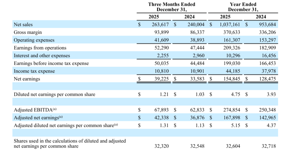 CEO Ted Harris stated that in 2025 the company delivered record sales of $1,037,000,000, reflecting 8.8% year over year growth and surpassing the $1,000,000,000 milestone for the first time. All three segments supported performance, and the fourth quarter marked the 26th consecutive quarter of adjusted EBITDA growth. Management indicated confidence in continued revenue and earnings expansion in 2026.
