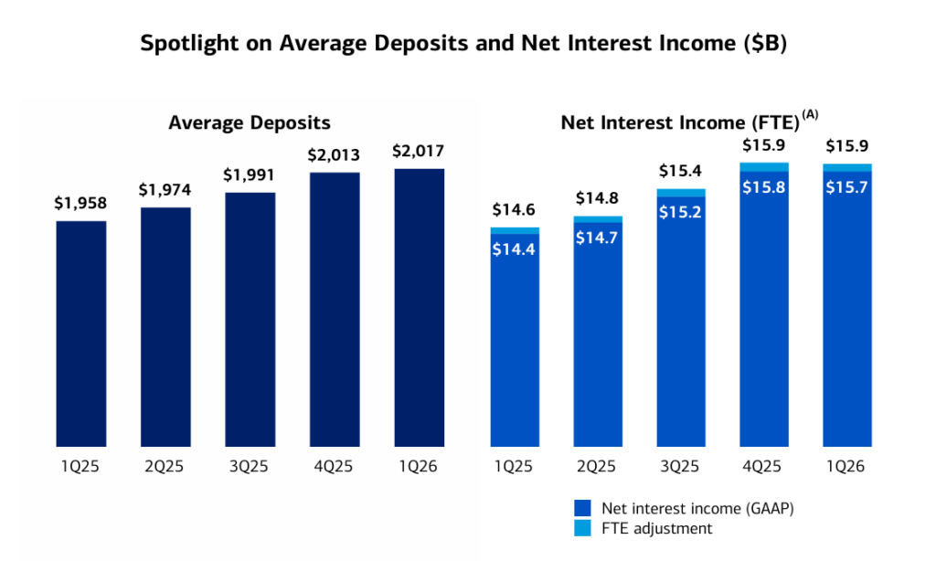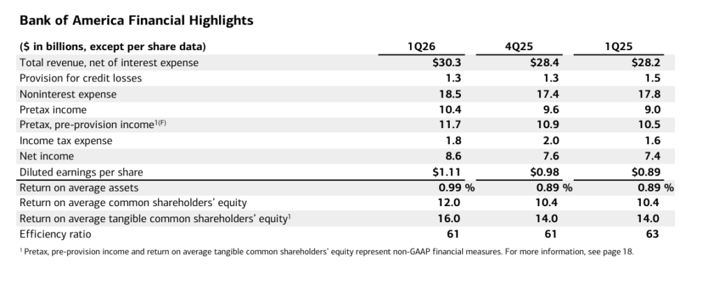 CEO Brian Moynihan said, “Earnings per share rose 25% year over year, starting 2026 with strong momentum, as revenue growth of 7% was driven by better than expected net interest income and double digit growth in sales and trading revenue, investment banking fees and asset management fees.”