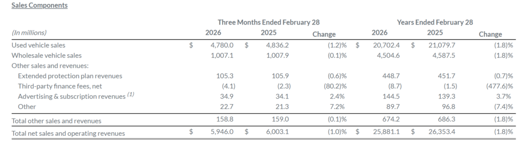 | Revenue | $7.55 billion, +6% YoY | $5.8 billion, −6.9% YoY (peer snapshot) | CarMax growing; peer facing sales decline. |