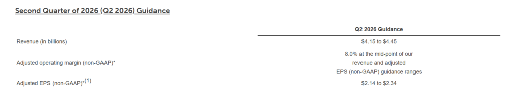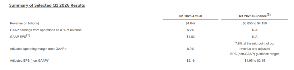| Revenue Q1 2026 | $4.047 billion | Within guidance range of $3.85 to $4.15 billion. |
