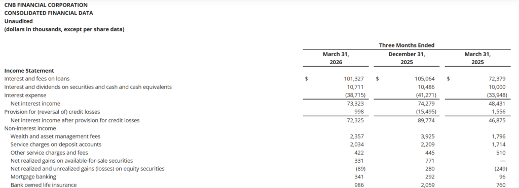 “In a quarter without significant merger related expenses from our ESSA Bancorp acquisition and related system conversion in 2025, these first quarter earnings reflect positive and sustained core results, including expected operating efficiencies… we are now focused on the growth opportunities presented in these new Northeastern Pennsylvania markets to complement the continued franchise expansion we are experiencing in our legacy CNB markets across our four state footprint.” – Michael Peduzzi, President & CEO.