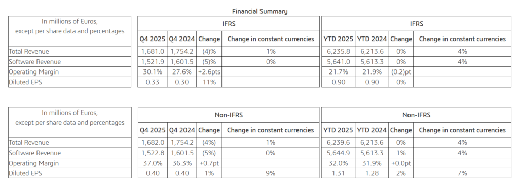 IFRS operating income increased by 5% to €506 million. Non-IFRS operating income declined by 2% to €622 million. The IFRS operating margin improved to 30.1%, compared to 27.6% in the fourth quarter of 2024. The non-IFRS operating margin increased to 37.0%, up from 36.3% in the prior-year period. IFRS diluted earnings per share increased by 11% to €0.33. Non-IFRS diluted earnings per share reached €0.40, reflecting a 1% increase as reported and a 9% increase on a constant currency basis.