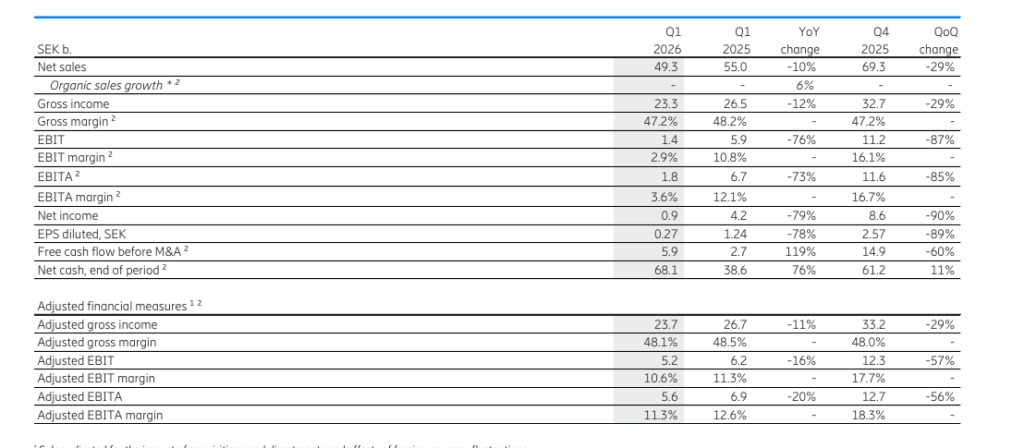 1. Reported net sales of SEK 49.3 billion, down from SEK 55.0 billion in Q1 2025, a decline of about 10%.