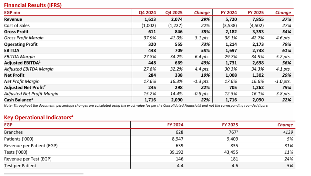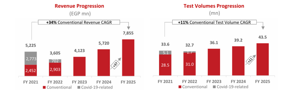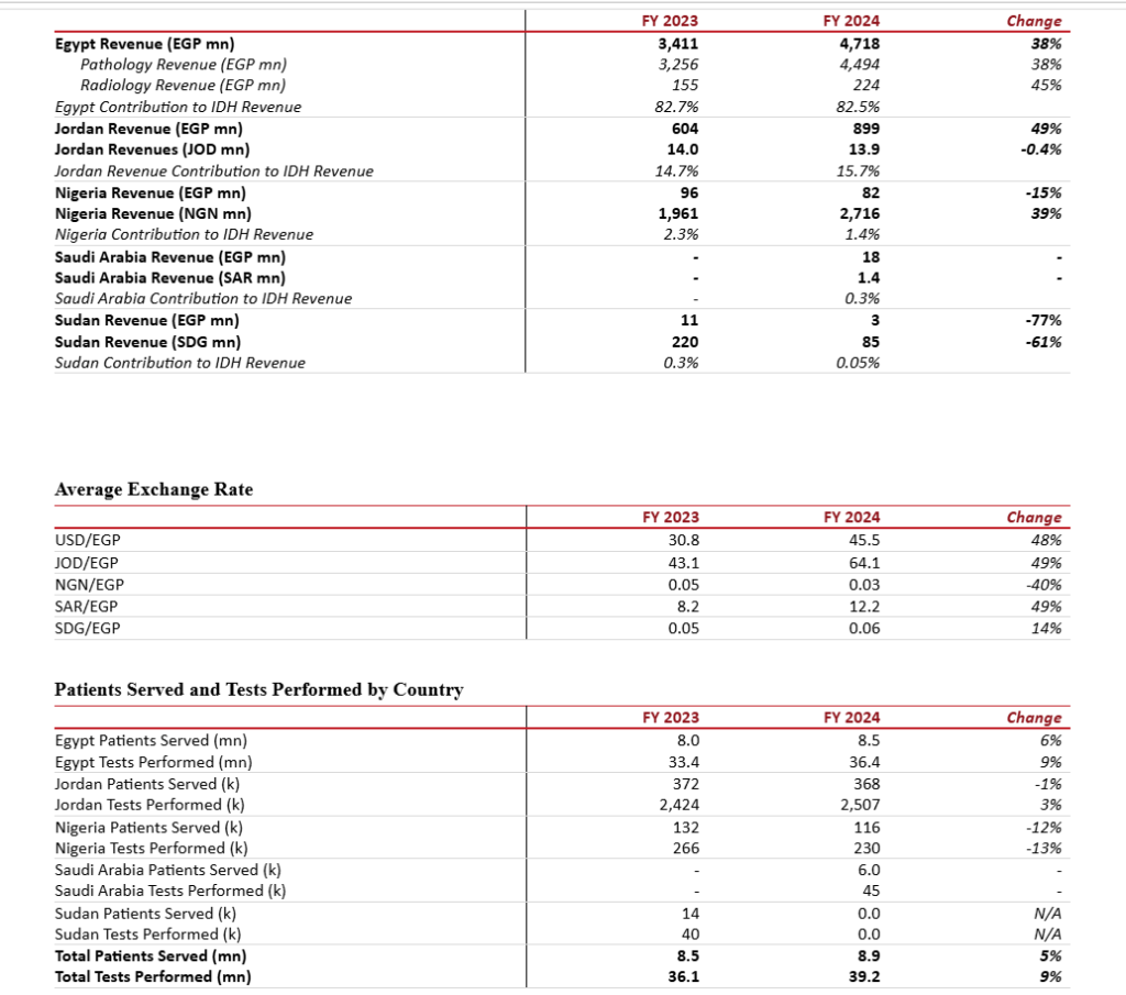 9. Egypt, representing 82.5% of revenue, generated EGP 4,718 million in FY 2024, up 38%, supported by 9% growth in tests and 27% higher revenue per test.