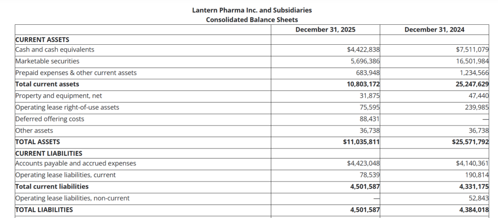 Lantern Pharma reported a Q4 2025 net loss of $4.1 million or $0.36 per share, an improvement from $5.9 million or $0.54 a year ago, driven by sharply lower R&D spend and tighter operating costs. Cash and marketable securities stood at $10.1 million at year end, while shares rose about 12.5% in aftermarket trading following the release, reflecting a constructive market reaction.