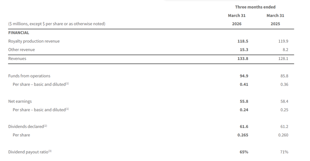 To give context, Freehold Royalties Ltd. (TSX: FRU), another Canadian energy royalty company, reports at different dates and has not yet released Q1 2026 results, so a true Q1‑on‑Q1 comparison is not available. Instead, the table below uses Freehold’s 2025 full‑year metrics as directional context, not a direct quarterly comparison.