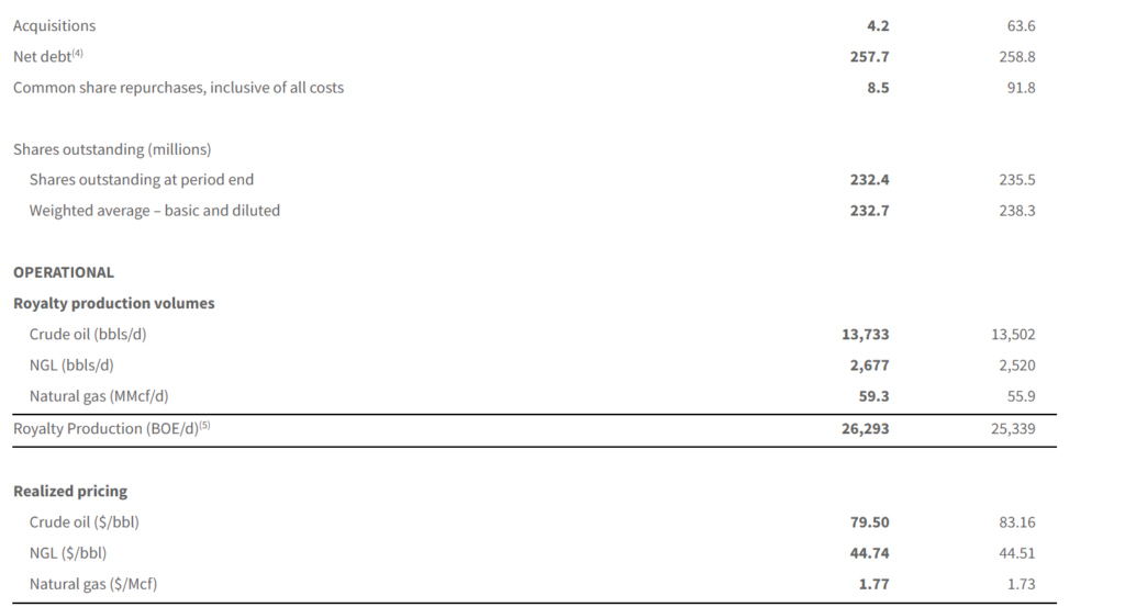 - Total royalty production averaged 26,293 BOE/d, up 4% year over year, including 13,733 bbl/d of oil and 2,677 bbl/d of NGLs and 59.3 MMcf/d of natural gas.