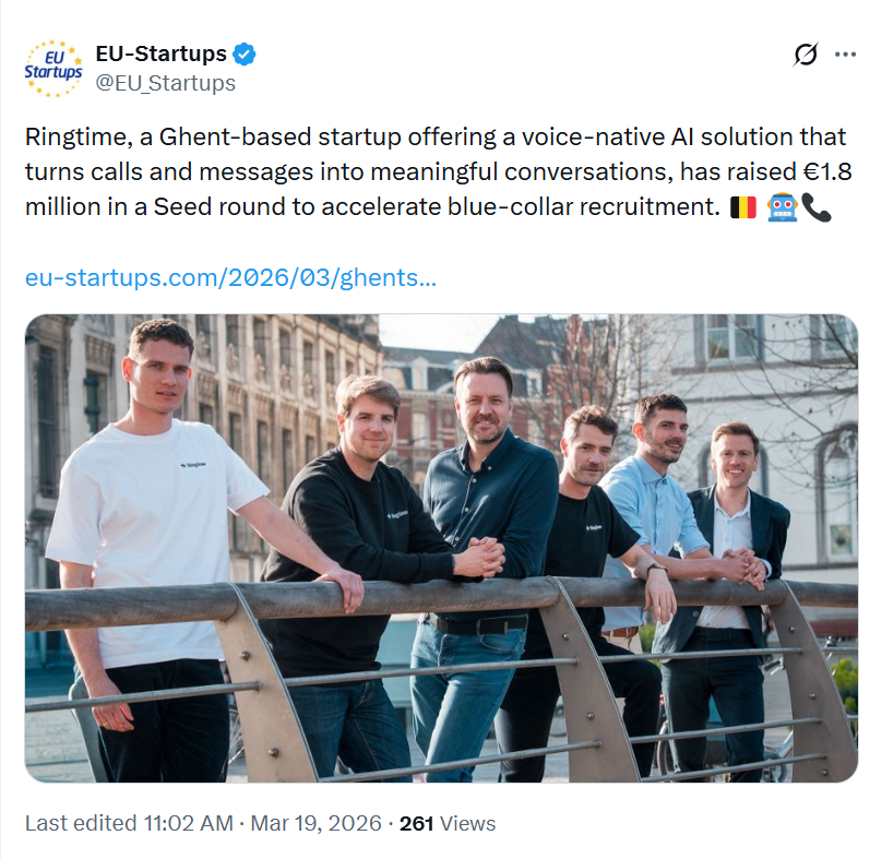 Ghent-based voice AI startup Ringtime has officially closed a €1.8 million seed funding round, the company announced in March 2026. The round was led by Volta Ventures, the Benelux-focused early-stage B2B software investor, with additional participation from Syndicate One, JK Invest, New School VC, and Allusion. Founded in September 2025 by a team of four, Ringtime is building AI-powered conversational agents that automate the most repetitive and time-intensive parts of blue-collar recruitment, from the first outbound call to candidate screening and job matching.