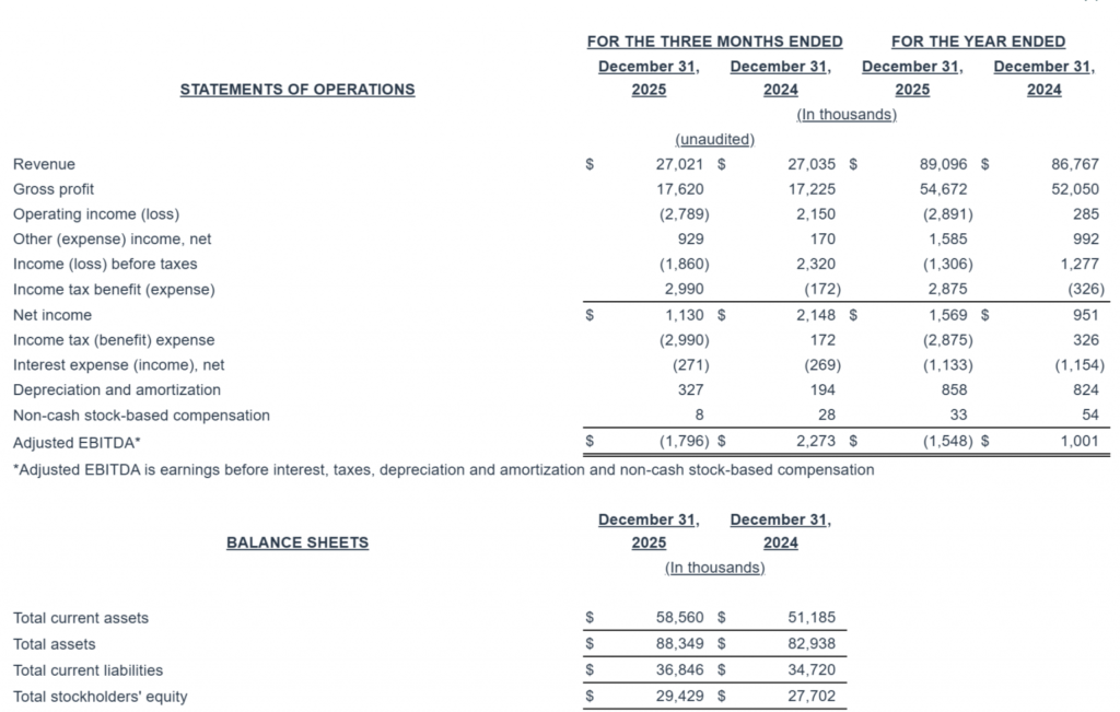“The Company’s annual revenue reached a record $89.1 million for the fiscal year 2025, an increase of $2.3 million, or 3%, when compared to the prior year’s revenue, despite the sale of its healthcare IT business unit in November 2025.” “Gross profit for 2025 was $54.7 million, up by $2.6 million, or 5% year-over-year, and net income for 2025 increased to $1.6 million from $951 thousand in 2024, mainly due to the increase in gross profit and recognition of tax benefits, partially offset by a write-down for impairment of goodwill.”
