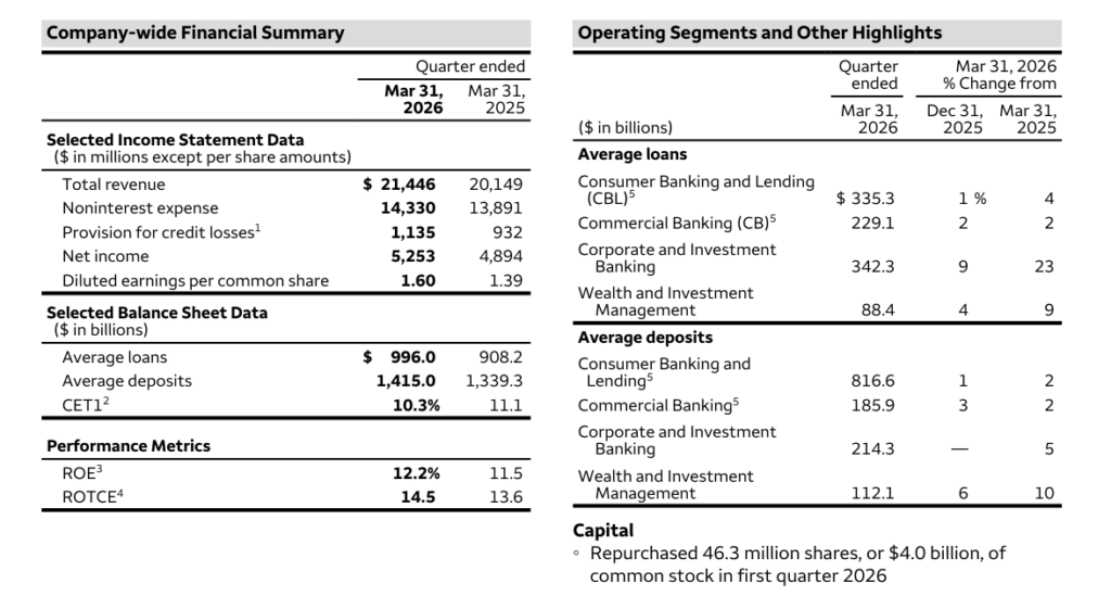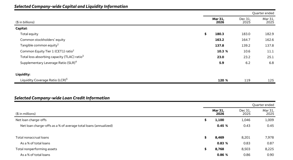 “Provision for credit losses in first quarter 2026 included a modest increase in the allowance reflecting higher commercial and industrial and auto loan balances, largely offset by a lower allowance for commercial real estate and credit card loans.” “We continued to operate with significant excess capital, returning $4 billion to shareholders through common stock repurchases while maintaining a CET1 ratio of 10.3% and an efficiency ratio of 67% as we invest in our businesses and pursue efficiency initiatives.”