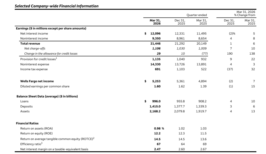 | Category | Wells Fargo Q1 2026 | Wells Fargo Q1 2025 | Change (%) |