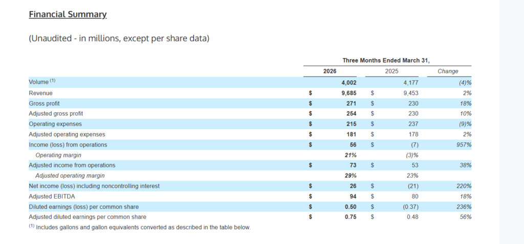 | Volume | 4,002 million gallons | Down 4% YoY; reflects portfolio simplification and non‑core exits. |