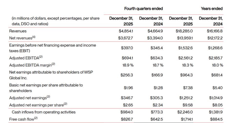 Key data points from WSP Global’s Q4 2025 and full-year 2025 results:
