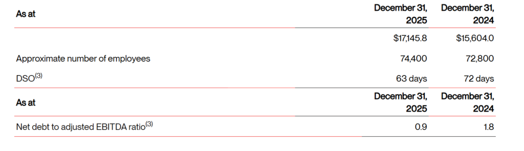 “I’m very, very pleased with our cash flow generation in 2025. Cash inflow from operating activities increased to C$2.25 billion in 2025, an improvement of C$865 million versus 2024. Full-year free cash flow totaled C$1.7 billion, representing 180% of our net earnings attributable to shareholders. This strong outcome reflects our ongoing focus on working capital management and optimization under our new ERP platform. DSO stood at 63 days as of December 31st, 9 days lower than at the same time last year, marking a record low level.”