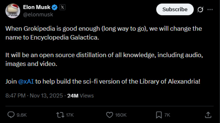 - According to Elon Musk’s post on X (Nov 13, 2025), Grokipedia may be renamed “Encyclopedia Galactica” when it becomes “good enough,” which signals a long-term branding goal.