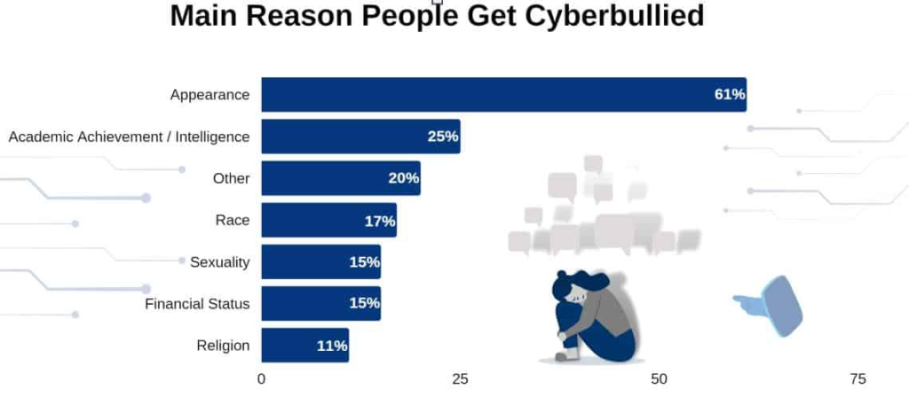 - Appearance is the most common reason people are targeted online, reported by 61% of individuals.